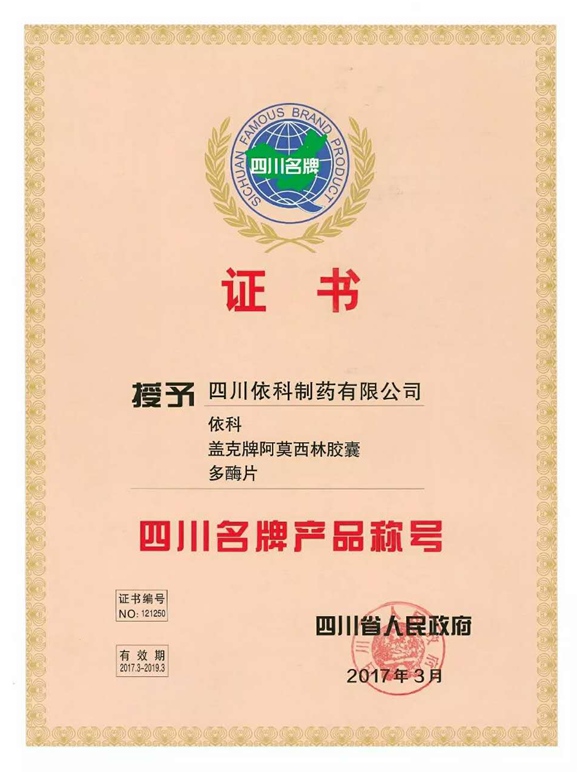 公司高度重视品牌战略,依法注册了“盖克”、“蜀中”、“三星堆”、“阿莫锋”、“益善源”、“蓉通”、“金年会最新登录”等108件注册商标,1999年“盖克”、2003年“蜀中”、2007年“三星堆”被认定为德阳市知名商标,2001年“盖克”、2004年“蜀中”被认定为四川省著名商标, 2008年“盖克”商标被国家工商行政管理总局认定为“中国驰名商标”。2017年3月,公司盖克牌、金年会最新登录牌阿莫西林胶囊和多酶片被四川省人民政府授予四川名牌产品称号。2016年,公司实现营业收入66373万元,利税7600万元;2017年,公司实现营业收入75045万元,利税7572万元。公司2017年被命名为德阳市第七批院士专家工作站,2016-2018连续三年被德阳市人民政府确定为重点龙头企业。